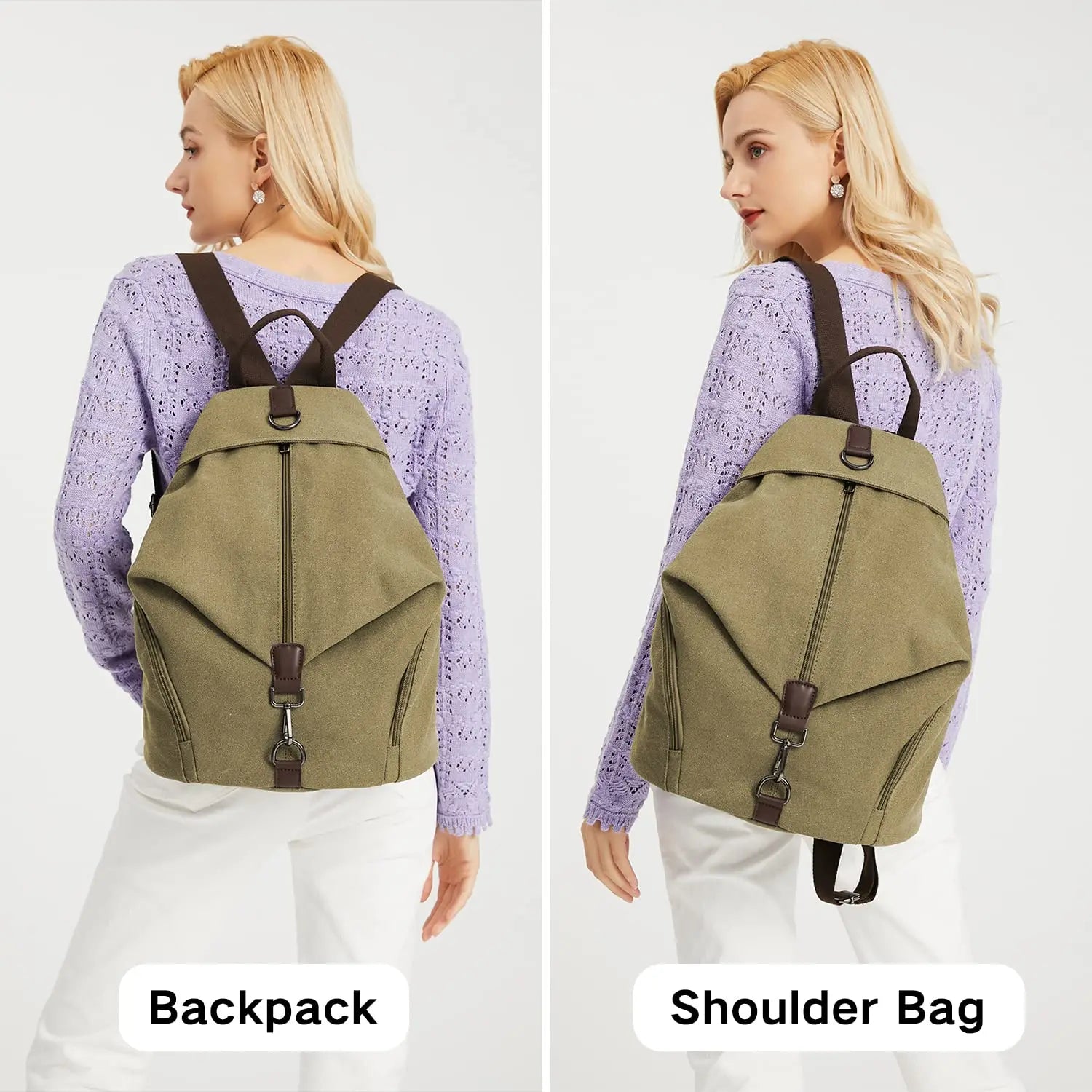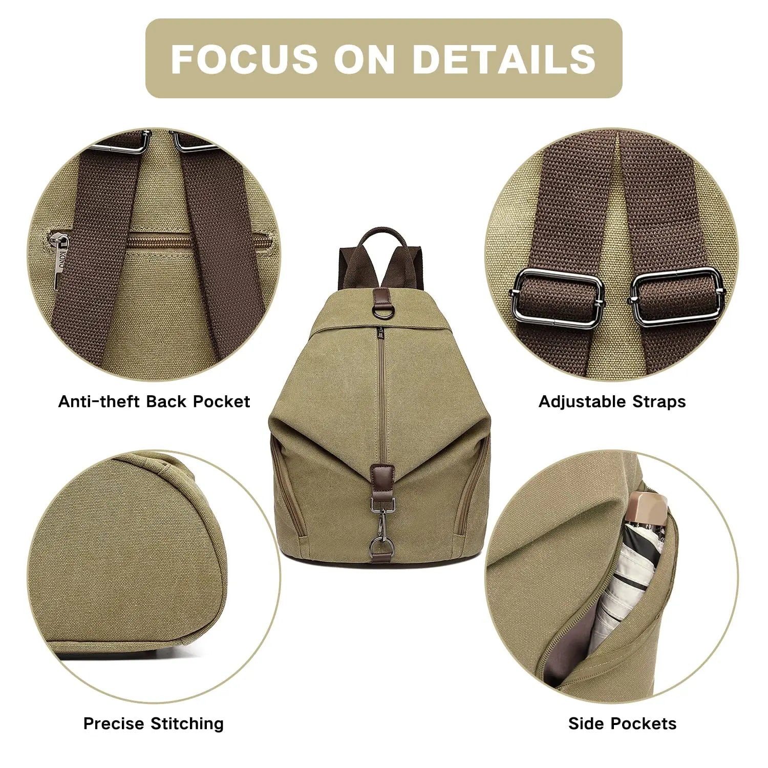 - Large capacity and well-organized hand fan : The vintage backpack includes a main compartment with zipper , 2 open inner pockets for mobile phone and keys, an inner zippered pocket, a rear anti-theft pocket, and 2 zippered side pockets. Plenty of storage space for your daily essentials.