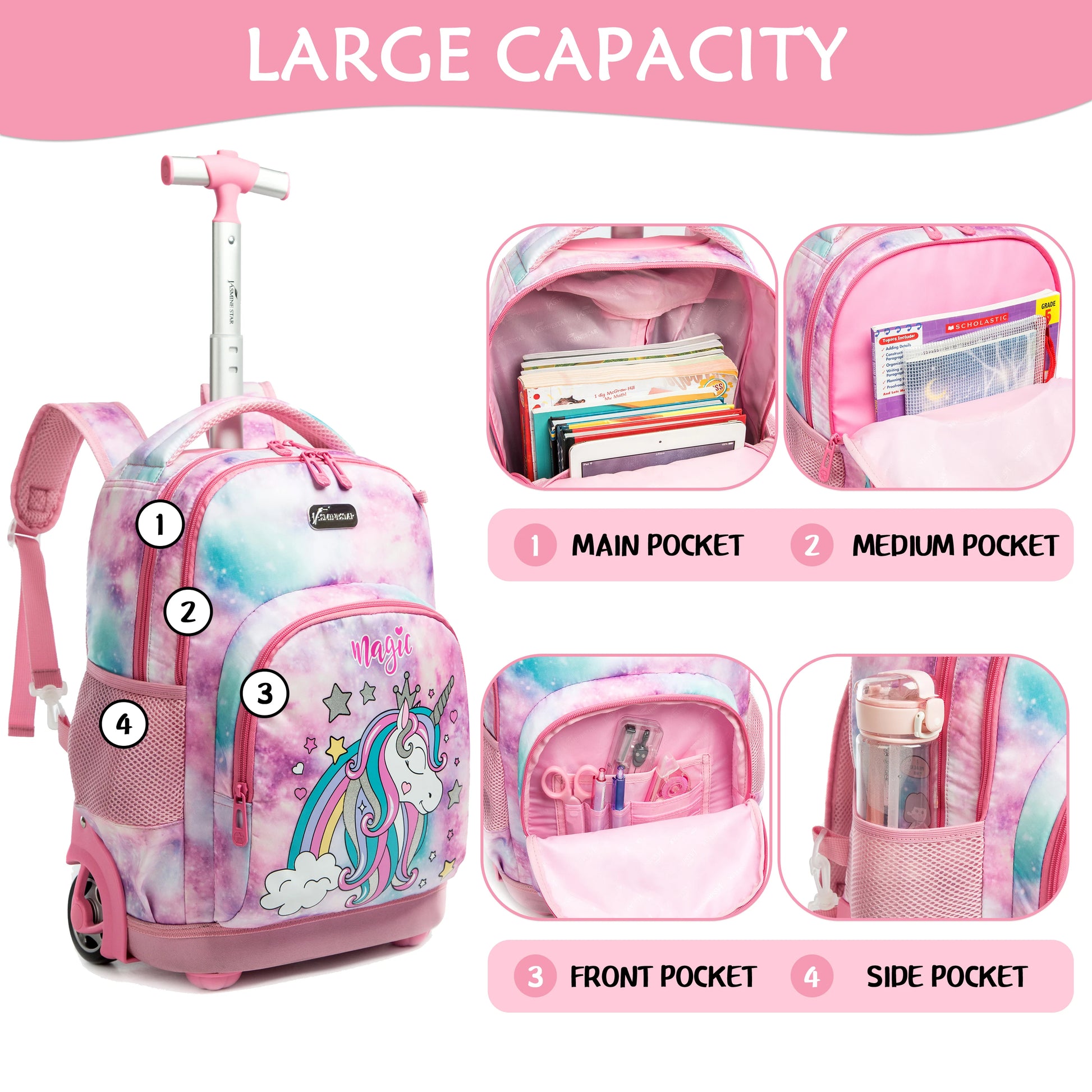- Sac à roulettes licorne : 42 cm x 19 cm x 30 cm.