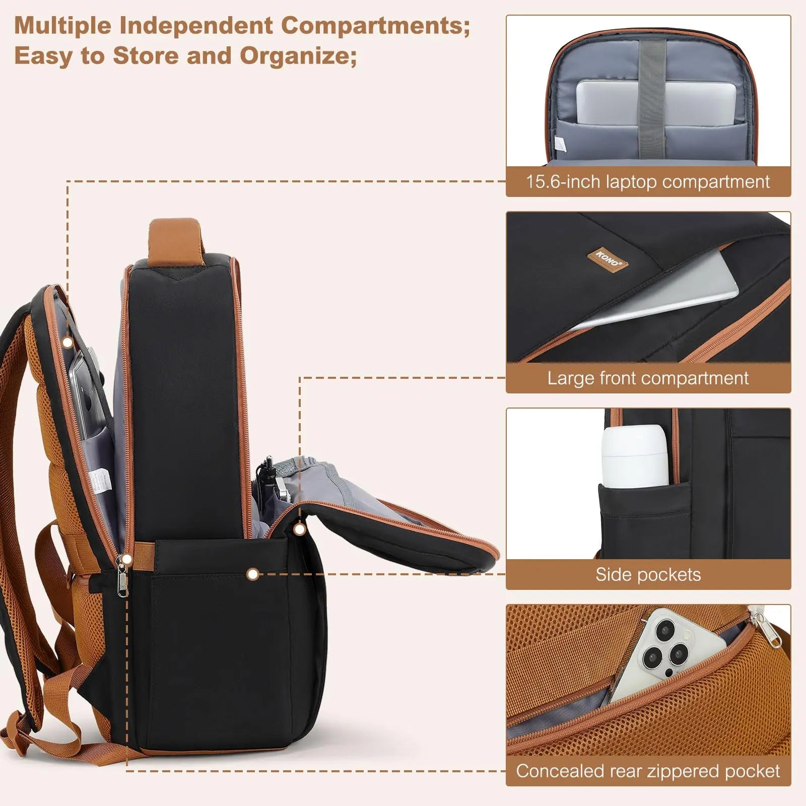 Ce sac à dos offre des dimensions généreuses de 42 cm x 30 cm x 14 cm (16,5 "x 11,8" x 5,5 ") avec un poids de seulement 0,75 kg. Le grand compartiment principal est bien organisé et contient un ventilateur à main enfichable, un ventilateur à stylo et des poches zippées sécurisées. Il existe également un compartiment spécial rembourré pouvant ranger en toute sécurité un iPad ou un ordinateur portable avec une taille d'écran allant jusqu'à 15,6 pouces.