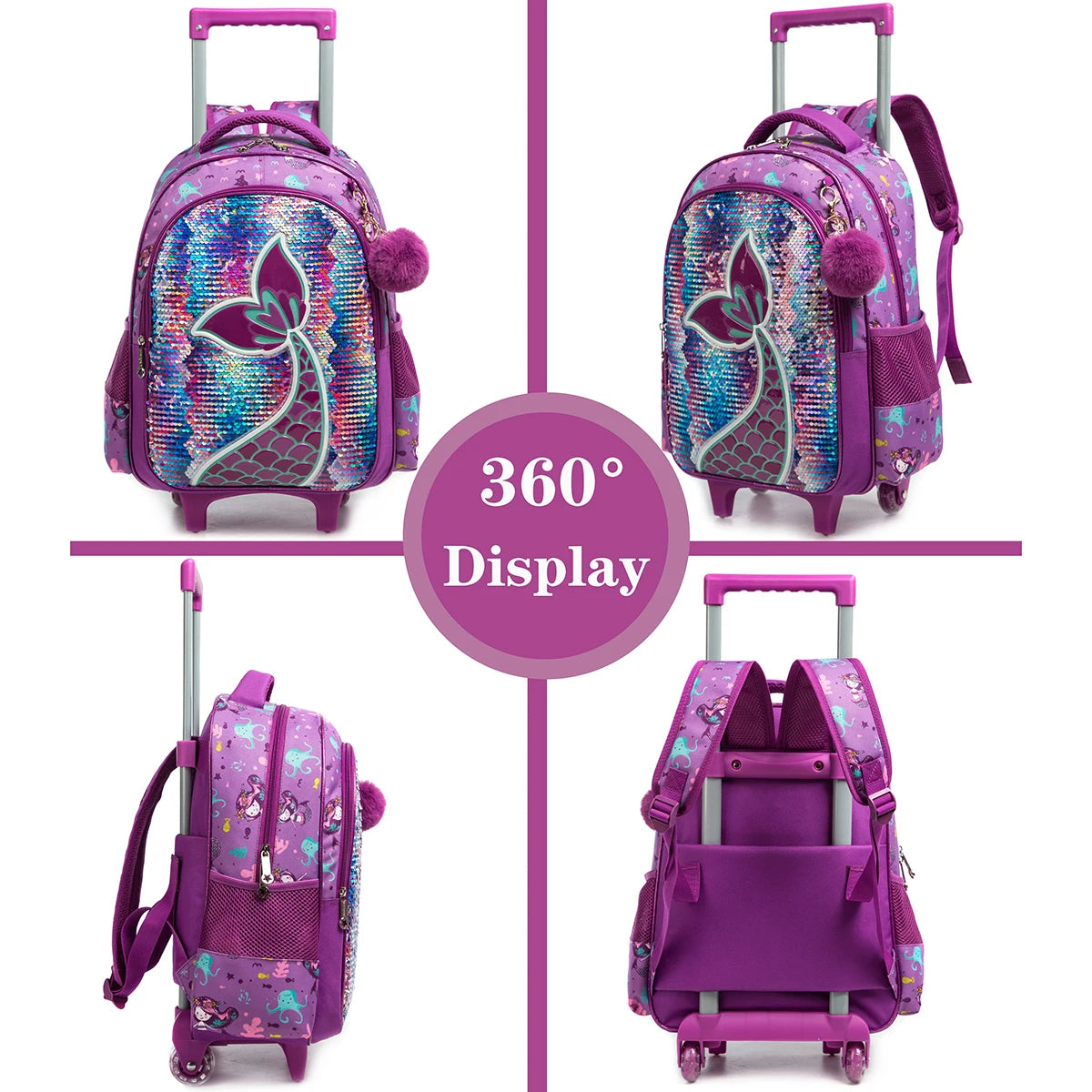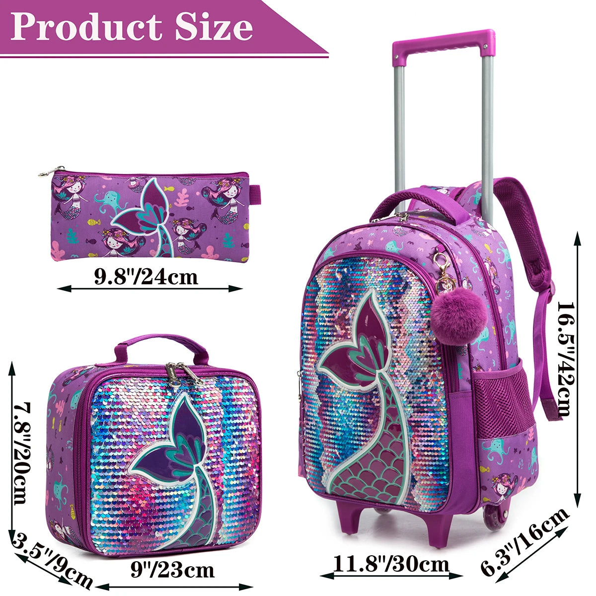 Ce sac à dos à roulettes sirène, ensemble de 3 pièces, est parfait pour les élèves du primaire. Il comprend un sac d'école à roulettes pratique, un sac à lunch isolant et un sac à stylos assorti, idéal pour organiser toutes les fournitures essentielles. Léger et facile à transporter, il simplifie les déplacements lors des journées d'école ou des voyages d'étude, offrant confort et fonctionnalité pour accompagner les enfants dans toutes leurs aventures scolaires.